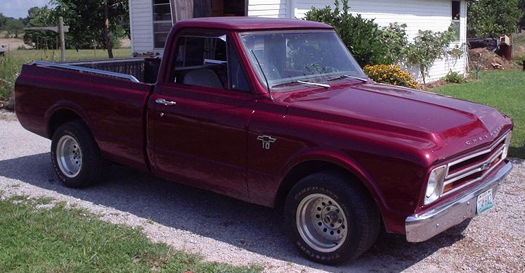 Below are a few modifications to the truck I have done. As far as appearance I have removed the side mirrors and replaced the stock rally wheels. Disc brake conversion is very simple on this model truck. The way I did my conversion was using a 1976 donor truck. The parts I used off the '76 was the spindles, rotors, steering center link, steering box, brake booster assembly, front brake lines & hoses, and the proportioning valve. On the later model booster I had to drill two new holes on the mount and drill a new hole on the break pedal for proper linkage. You could also find a disc booster for a 69 to 72 and it should bolt right in with no modification to the booster or pedal. You can use the '76 tie rods and ball joints if you want, but I purchased all new parts for my conversion. Buy your parts for a 1976 Chevy 1/2 of course. Also when getting a front end alignment, mention it's a '76 front end. On my conversion I also went from 6 bolt pattern wheels to the common 5 on 5 pattern. As you can see from the picture below, the front wheels stick out more then the rear. One reason is I used 10 inch wide wheels, but I also believe that the wheels are farther apart on the later models. I measured the rear end on my 67 and that of a 70+, and the 70+ is 3 inches wider. 1970 used the 3" wider rear end, 5 on 5 pattern, and still used trailing arms. This is the rear end of choice to change to 5 on 5 pattern and move the wheels outward, like the front. If you want to convert to disc and keep your 6 bolt pattern, 1969 is the year to find. 69 had 6 bolt with disc from the factory. I'm not sure if the tie rods are different from 67 to 69, check with parts store, it may be easier on some years the others. I have read that a lot of people change the entire front saddle on the truck. This is an option too. I already had new A arm bushings installed so I wanted to keep them. Good luck on your disc conversion, any questions feel free to email me! brendanpatten@hotmail.com