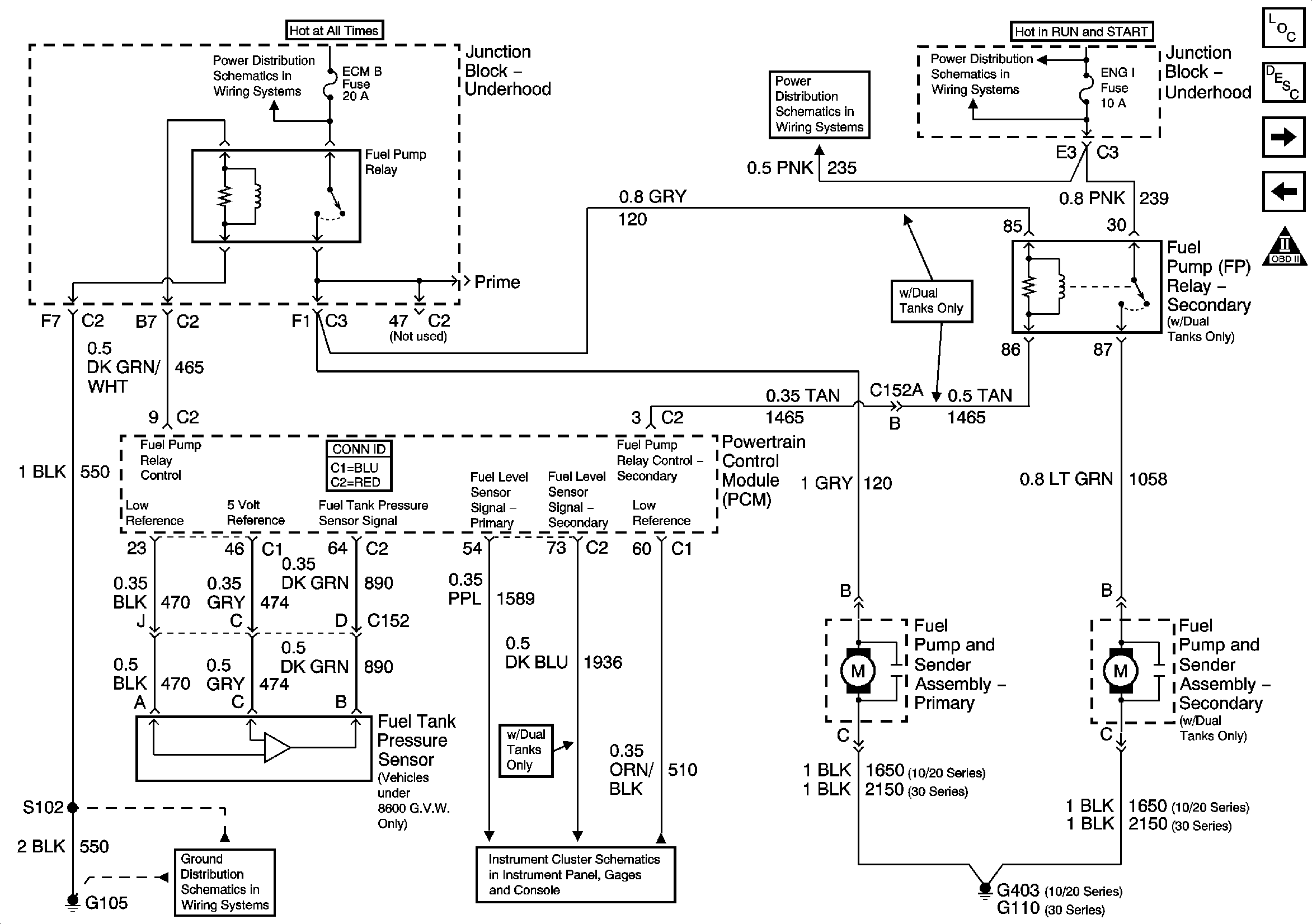 Pump Relay, Fuel Tank Pressure Sensor, Primary and Secondary Fuel Pump and