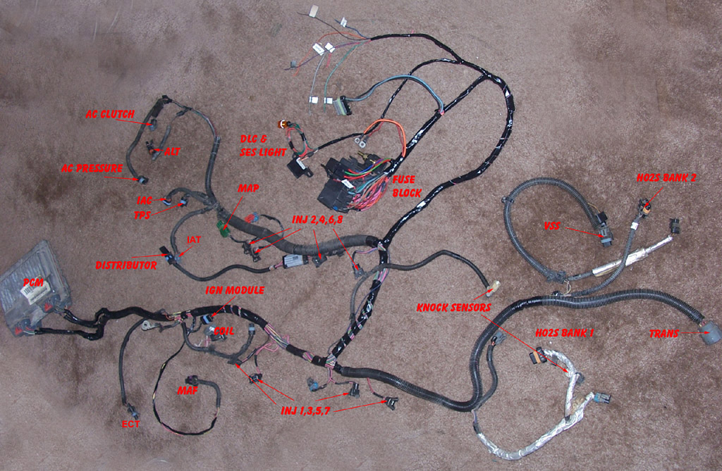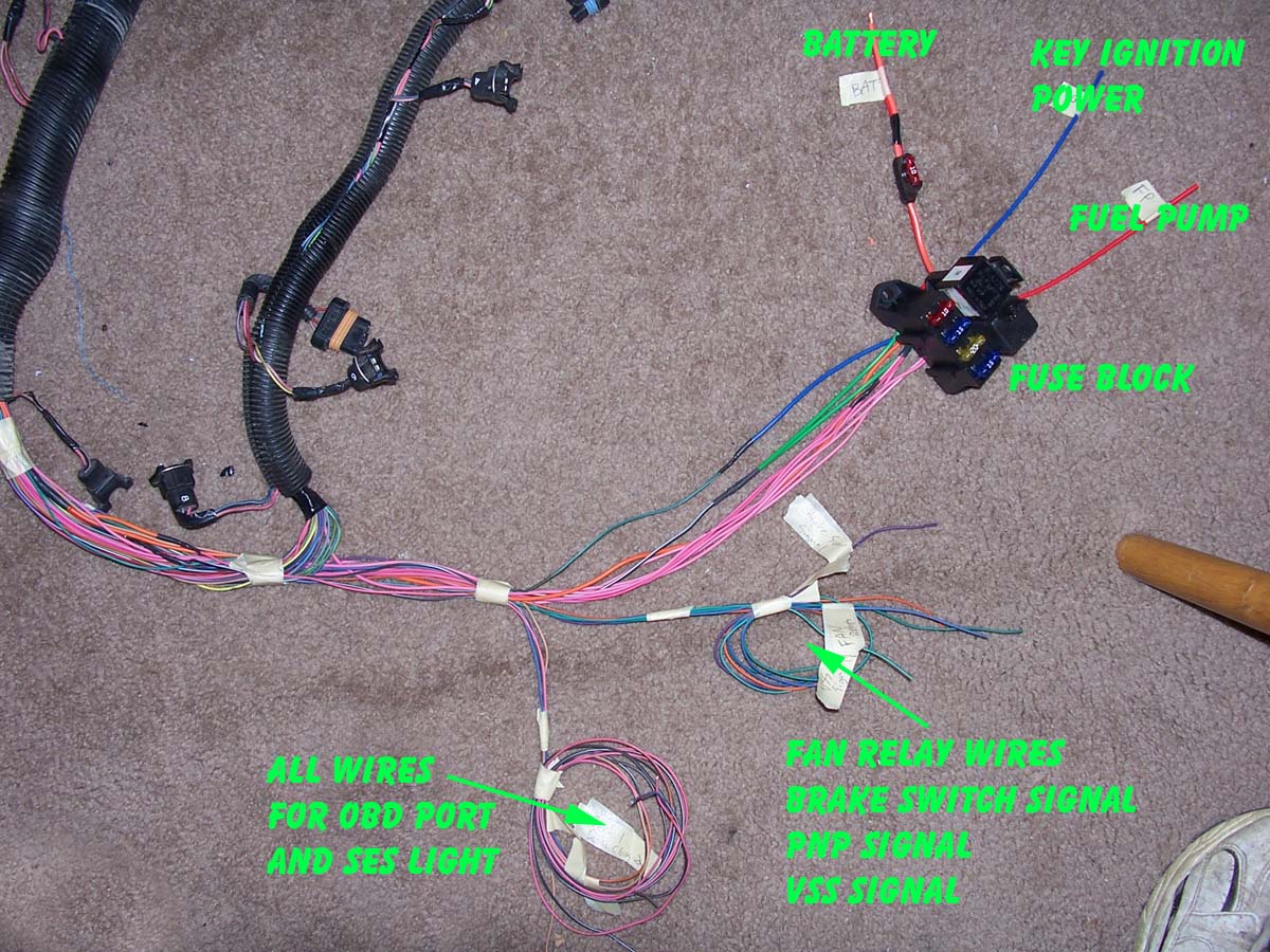 I've modified a 1994 L99 Harness. This was the baby LT1, 4.3L version. Everything is the same. The Caprice harness uses an underhood fuse block that is part of the engine harness. It is easier just to leave it in the harness and use it. My main modification was to take the wires coming from the ignition switch, and wire them in through a relay instead. Now when this relay is turned on, it functions the same way the ignition switch did. It feeds power to the fuses that then send power out to all the devices needing it. There are 3 ground wires, all located on the front of the drivers side cylinder head.