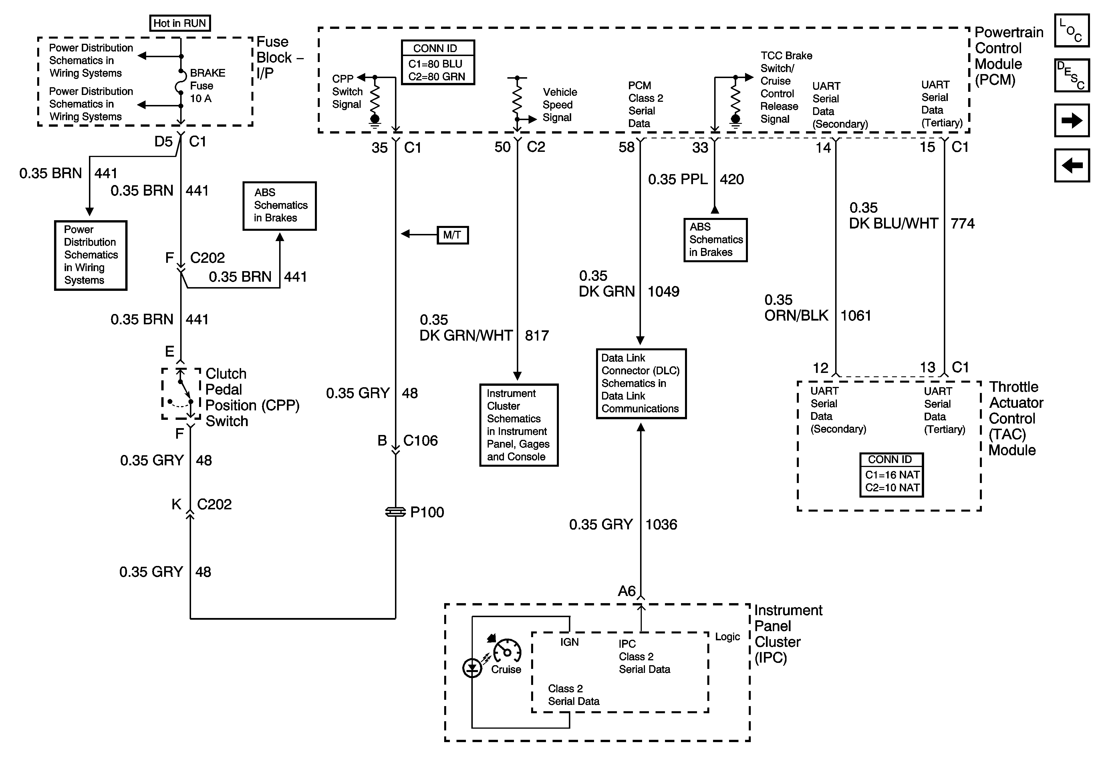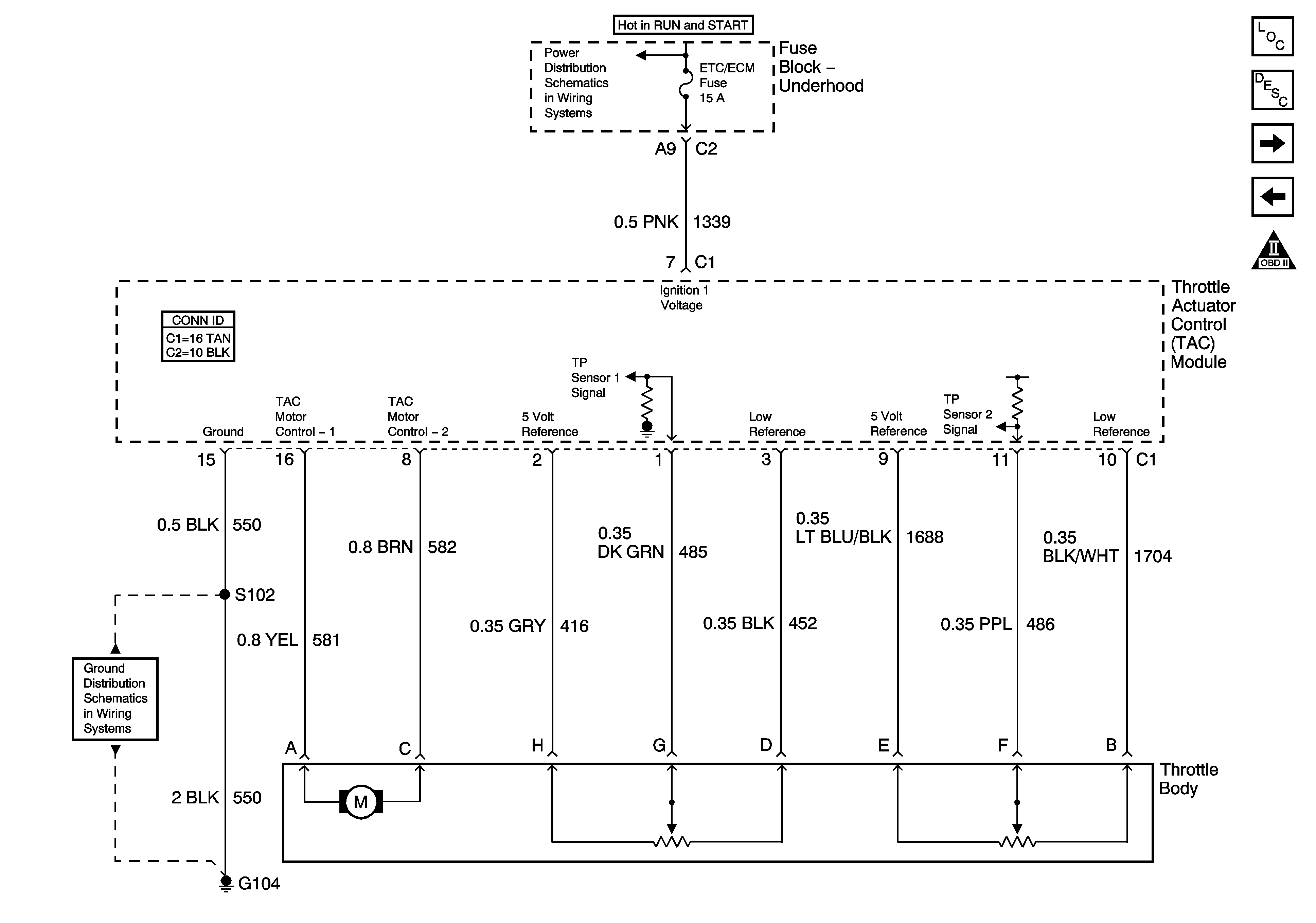 Drive By Wire = Electric motor controlling throttle blades. Gas pedal is a sensor, that feeds to a TAC Module (Throttle Actuator Control) The TAC module monitors the gas pedal sensor, then commands the throttle body motor to set the desired throttle setting. The TAC module also communicates with the PCM. Without this communication, the TAC module will not operate the throttle blade, and will cause codes to set in the PCM. DBW was found on all Corvette's starting in 1997. Some higher end SUV's around 2001 started getting DBW. In 2003 all Pickup Trucks got DBW. In 2004 the Express Van got DBW. If you are getting a motor from a salvage yard, be sure to get the Gas Pedal Assembly, TAC Module, and harness that runs from gas pedal to TAC module. It's a short harness, with a rubber grommet where it passes through the firewall. The rest of the wiring is part of the engine harness. Wiring Schematics - Typical 2004 C/K Pickup 4.8 / 5.3 / 6.0