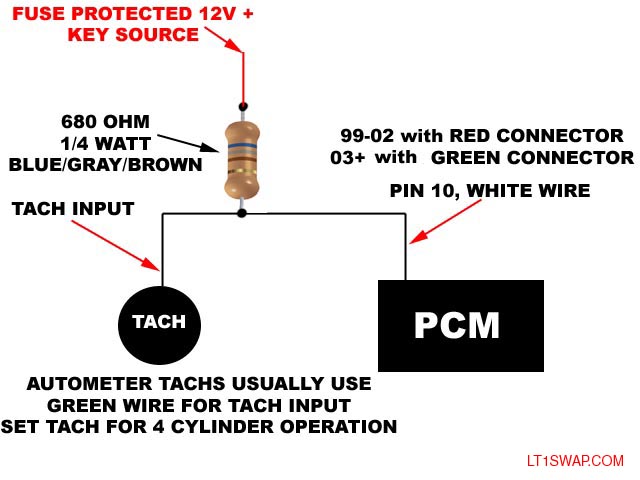I have found that some PCM's tach signal is not strong enough for some aftermarket tach's. I used this method to fix the tach signal on my 2003 PCM with an Autometer 5" tach. All you do is hook one end of a 680 ohm resistor to the tach wire, and other end of resistor to key 12v+. The tach wire is found on the RED PCM connector for 1999-2002 vehicles and the GREEN PCM connector on 2003-2006 vehicles. This may not be needed on all, I have had a 12200411 PCM from a 2001 work just fine without the resistor. So far, all 2003+ have had to have it.